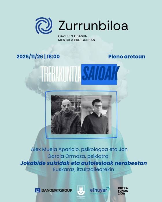 Alex Muela Aparicio psikologoak eta Jon García Ormaza psikiatrak gidatuko dute trebakuntza saioa. García Ormaza neurozientzietako ikertzailea da EHUn eta mediku psikiatra Zamudioko Ospitalean. Suizidioan espezializatua dago. Eta argi du zein den suizidioa prebenitzeko modurik eraginkorrena eta sinpleena: sufritzen ari den gaztearengana gerturatu eta, epairik gabe, entzutea. Horixe egingo dute, esaterako, Elgoibarko saioan, Laura De la Iglesia Sanchez gazteak bere esperientziaren berri emango baitu.