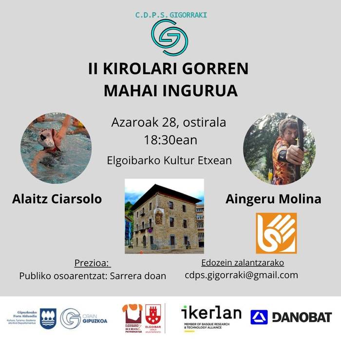 Iaz egin zuten aurrenekoz era honetako saioa, eta Gentzane Ortiz (borroka librea) eta Aitor Bedialauneta (mendi lasterketak) izan ziren hizlariak. Aurtengoak Alaitz Ciarsolo waterpolo jokalari eibartarra eta arku tiraketan aritzen den Aingeru Molina elgoibartarra izango dira. Elgoibarko Kultur Etxean izango da mahai-ingurua, 18:30ean hasita. Antolatzaileek parte hartzera animatu dituzte herritarrak, gorren komunitatea eta kirolean dabiltzan gorren bizipenak gertutik ezagutzeko aukera izango dela-eta.