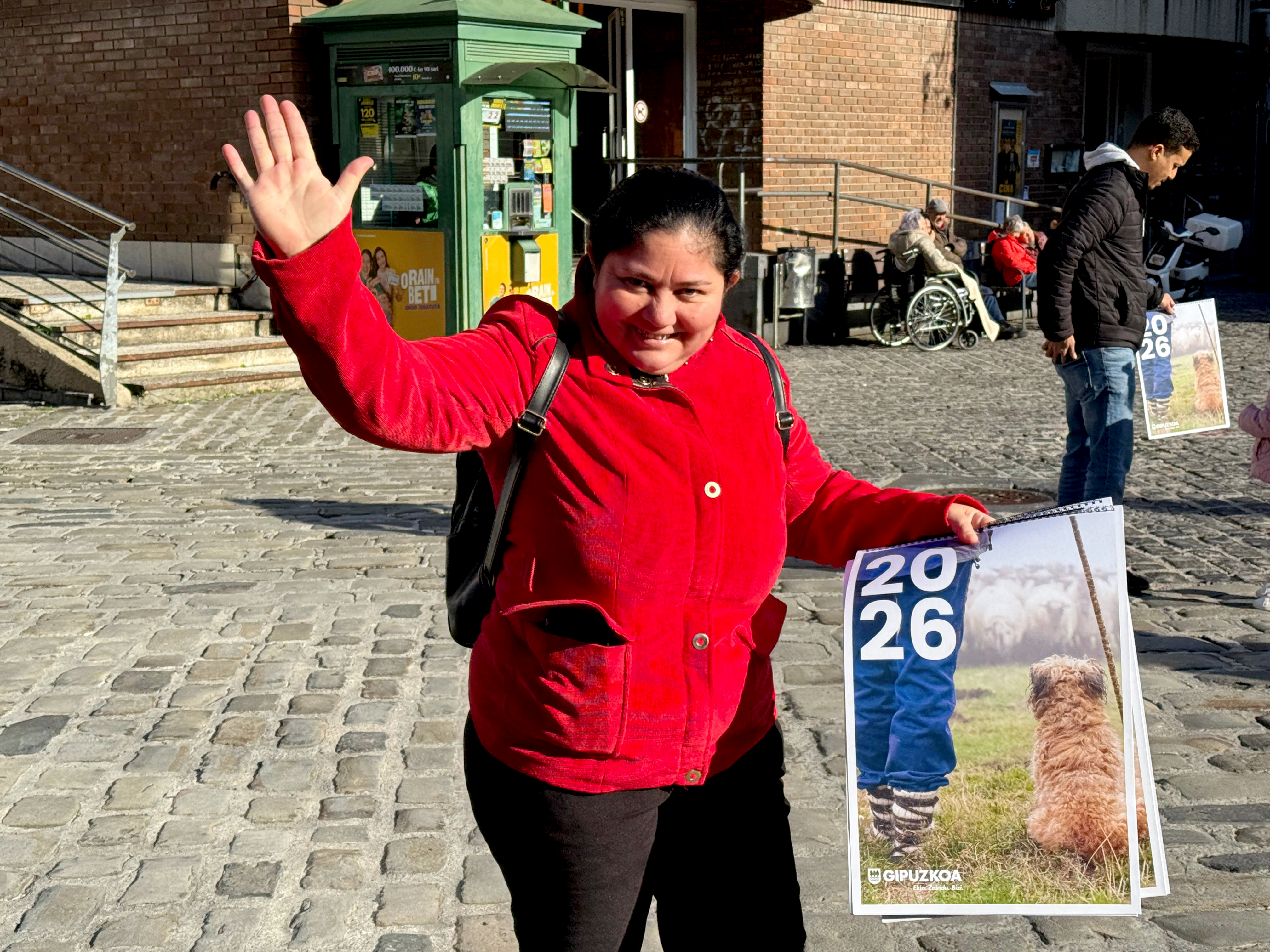 Egutegiaren 500 ale zituzten gordeta Elgoibarren banatzeko eta ordubetez jardun zuten horiek debalde banatzen Kalebarren plazan. Gero, Mendaroko Herriko Enparantzara joan ziren egutegiak banatzen jarraitzera.