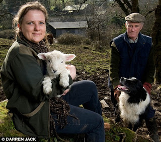 | Rebecca eta bere aita Devon-eko etxaldean arkumea eta txakurrarekin |